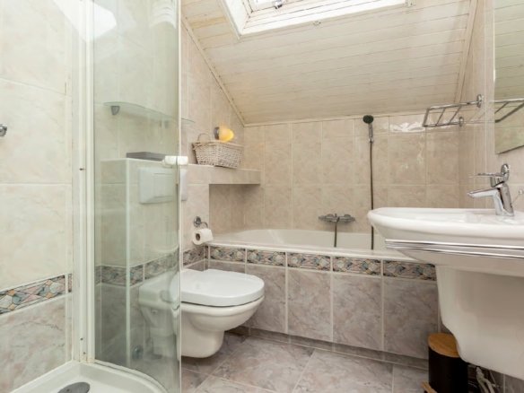 Landing with built-in cupboard housing the central heating system. Three well-sized bedrooms (main bedroom at the rear, two at the front). Fully tiled bathroom with bathtub, shower, second toilet and washbasin.