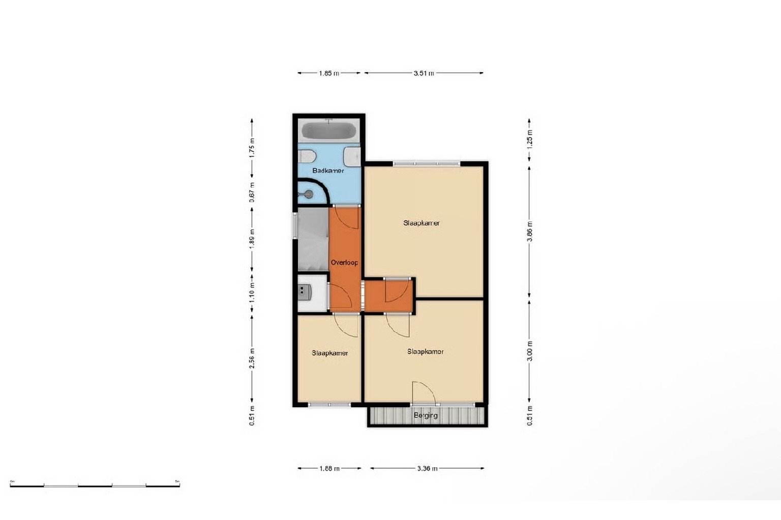 Overloop met vaste kast en cv-ketel. Drie goed bemeten slaapkamers (hoofdslaapkamer aan de achterzijde, twee aan de voorzijde). Volledig betegelde badkamer met ligbad, douche, tweede toilet en wastafel.